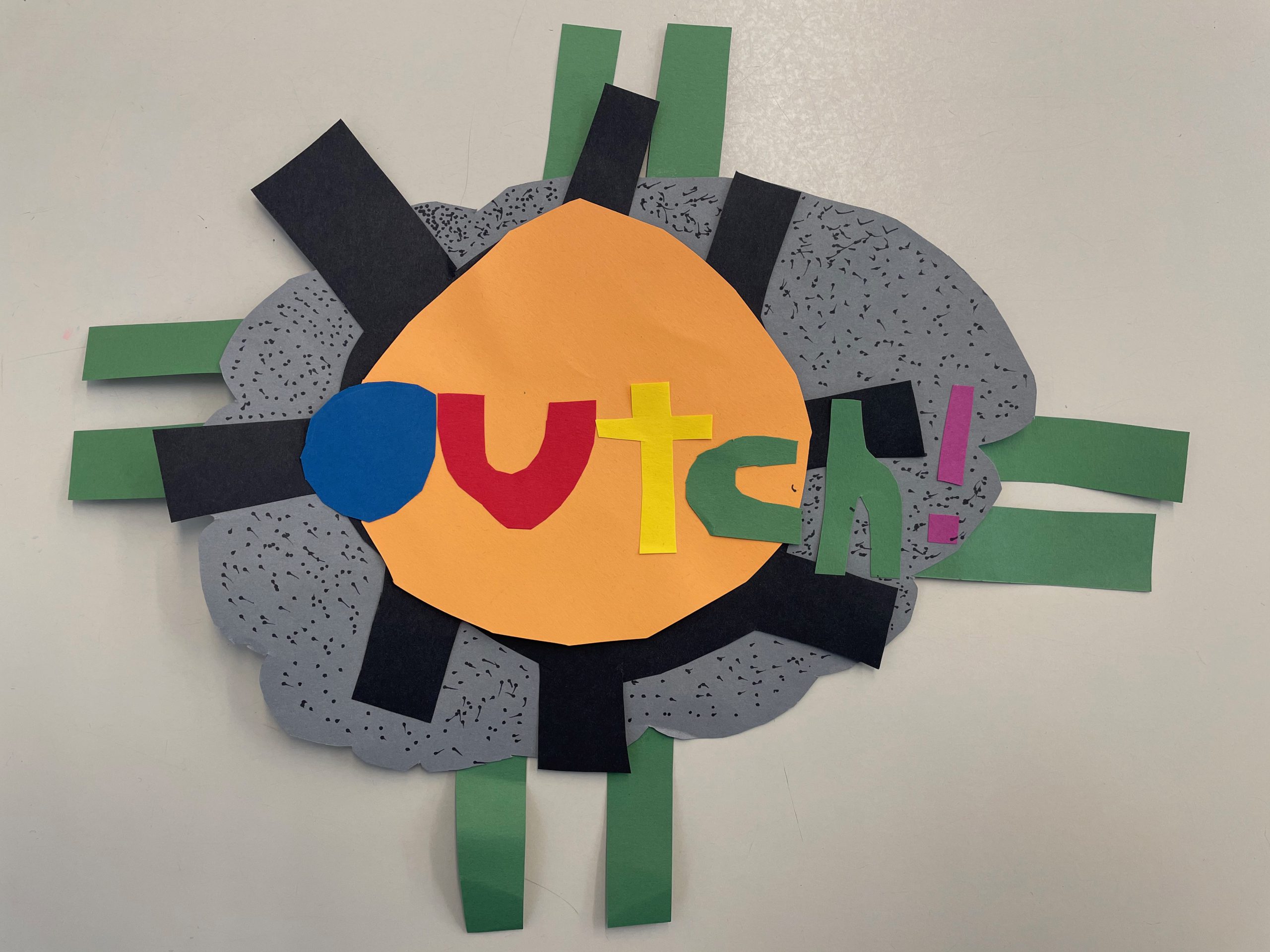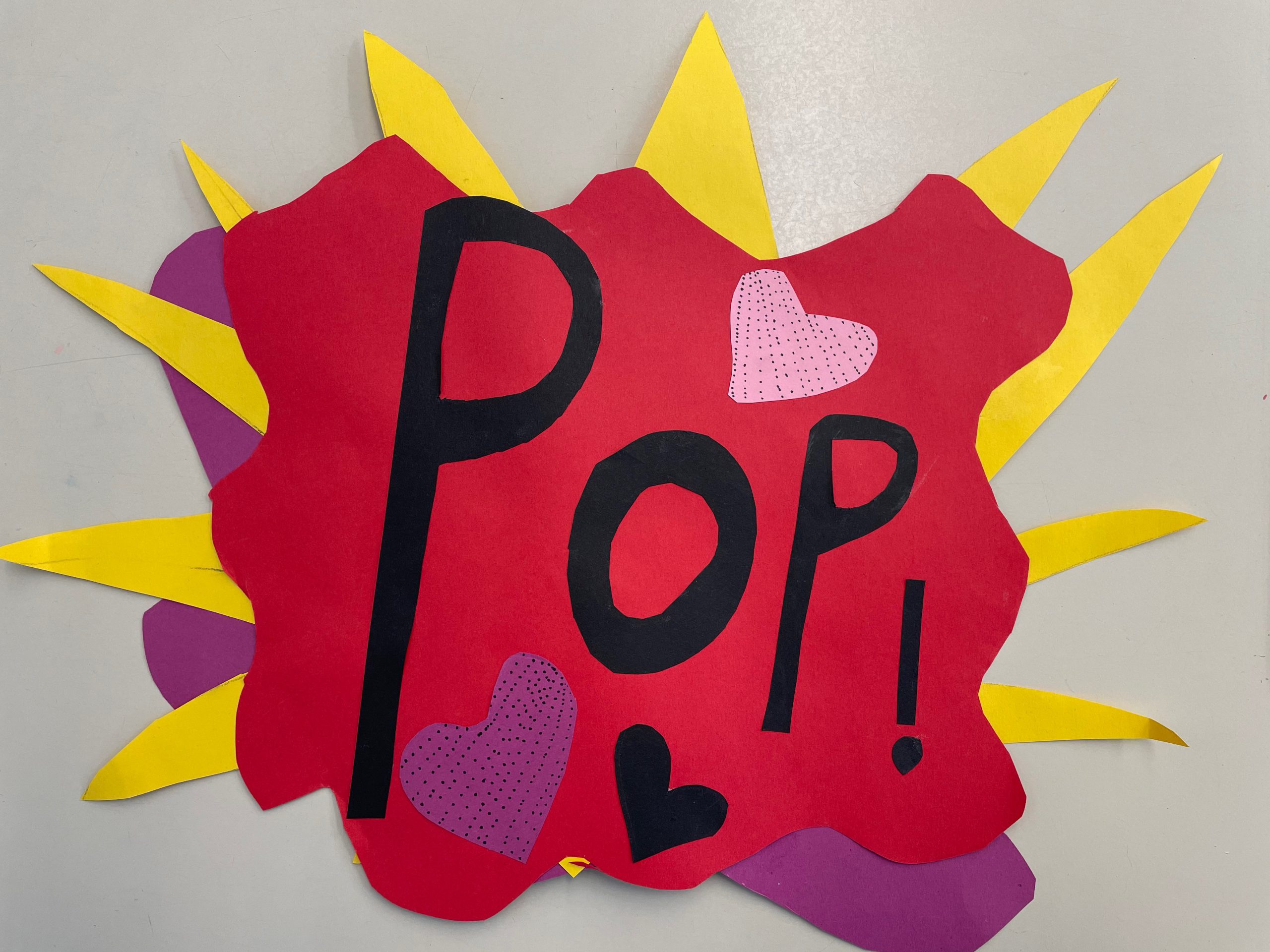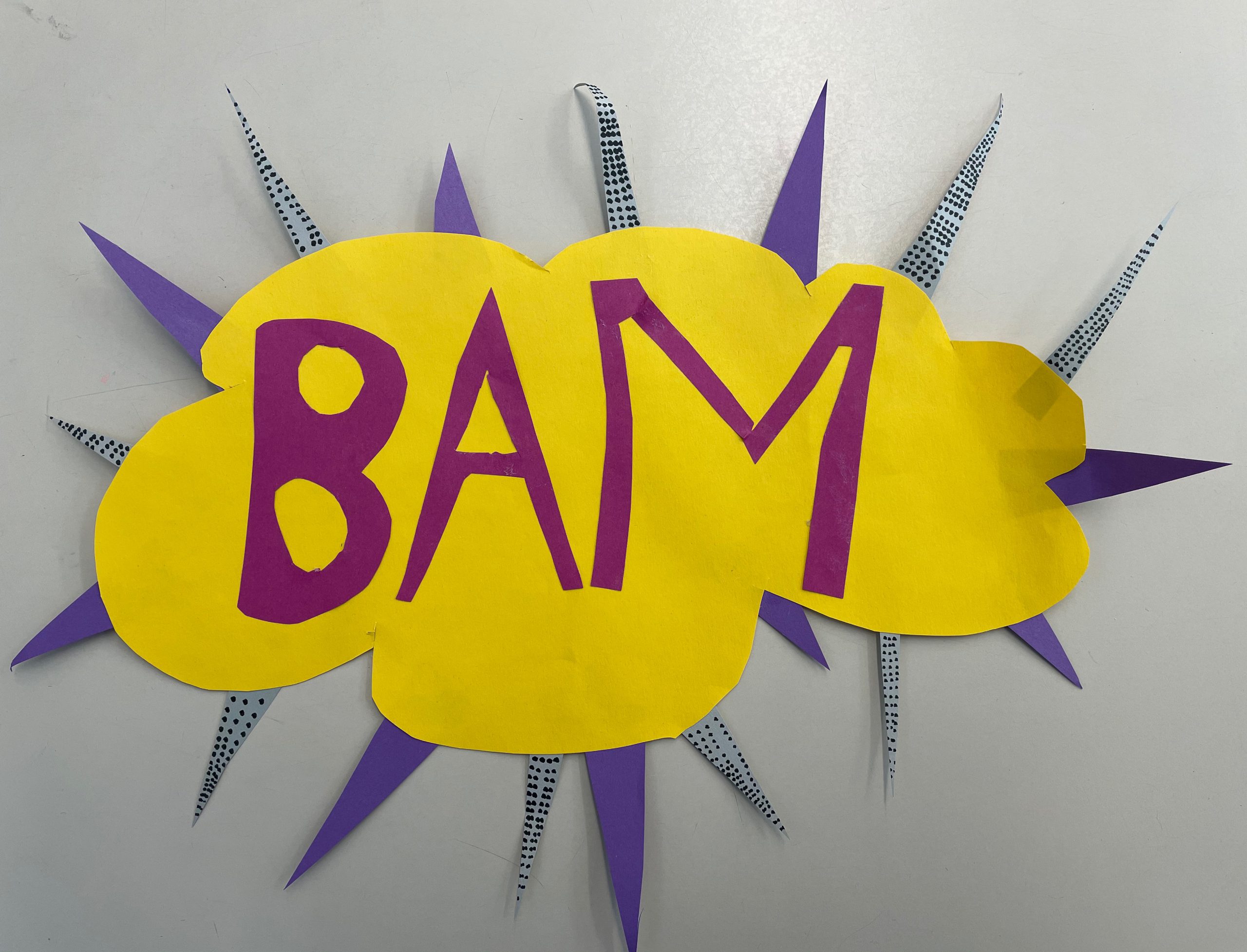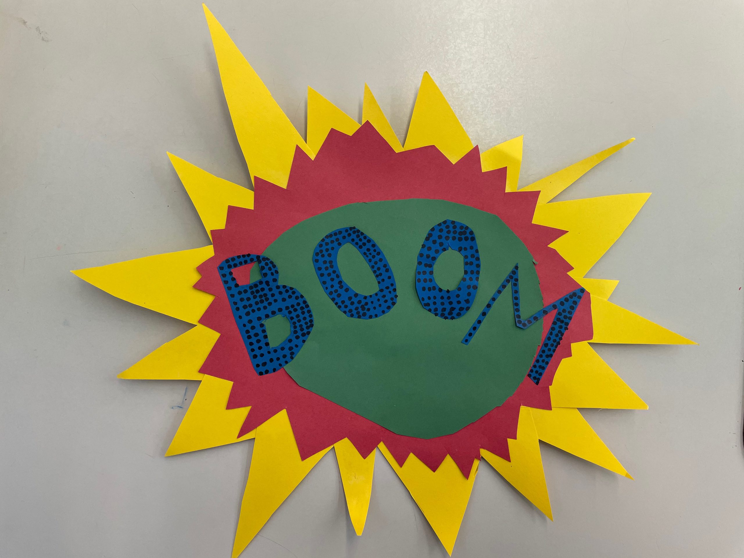 - Nous avons choisi une onomatopée et l’avons découpée pour la coller sur le fond.