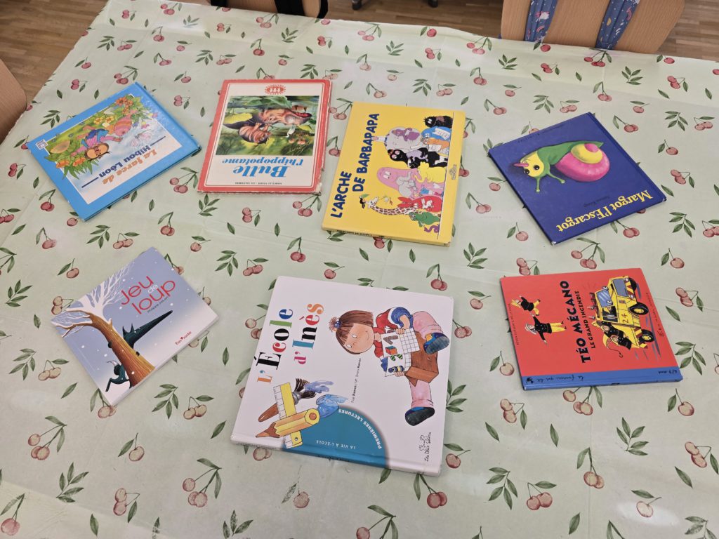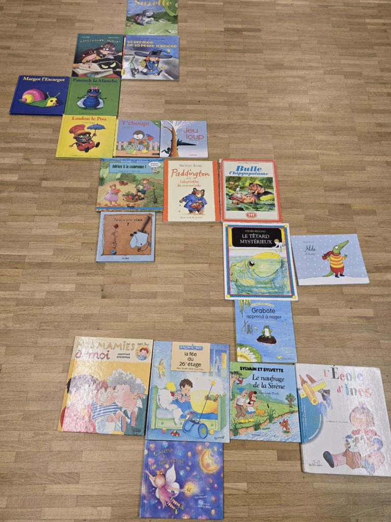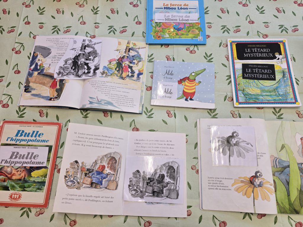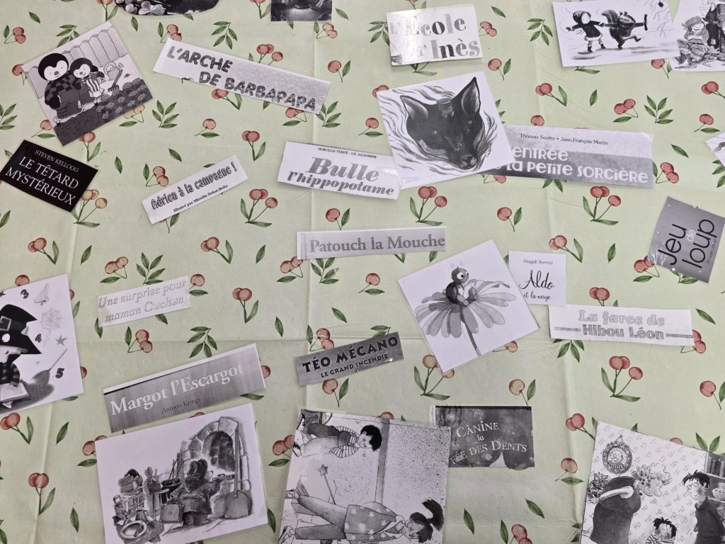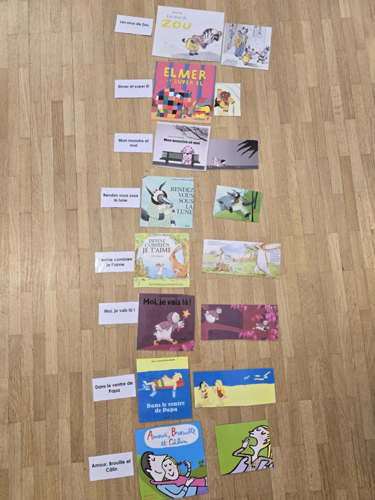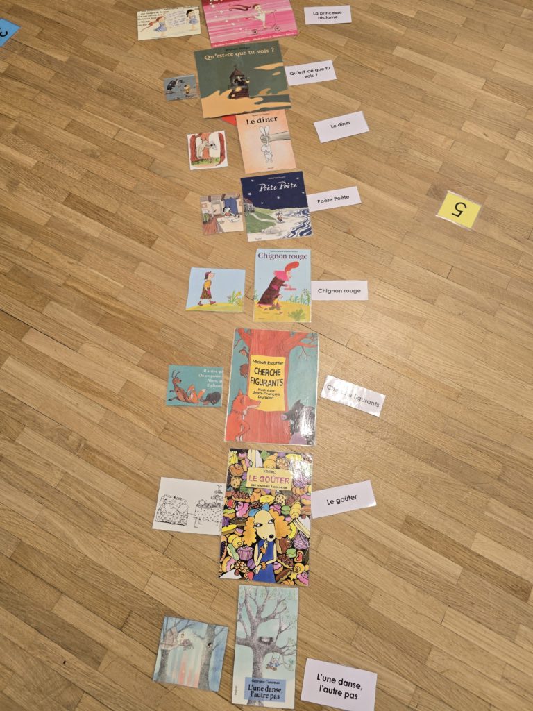 Puis, nous avons aligné les couvertures afin d’associer à chacune d’elles son titre (en comparant les lettres) et une image (en observant les personnages).