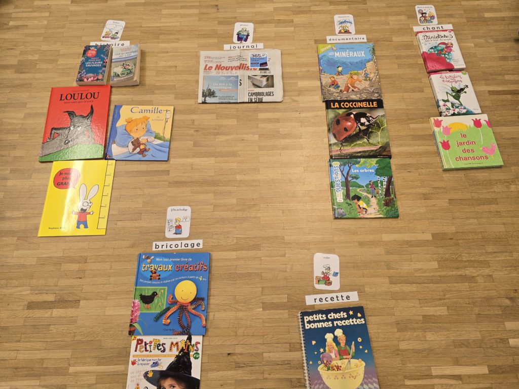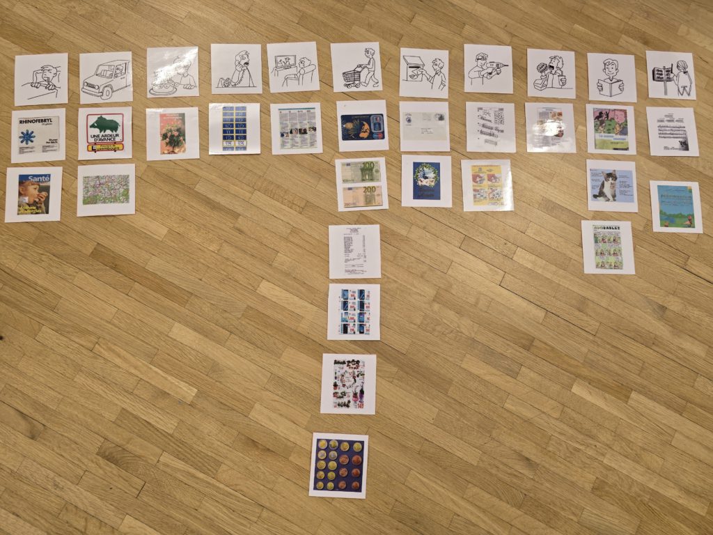 Nous avons dû observer et discuter autour de documents écrits et les classer en fonction de leur utilité. Nous nous sommes rendu compte que nous étions amenés à lire dans de nombreuses situations pour : se soigner, conduire, téléphoner, regarder la télévision, faire ses courses, lire son courrier, bricoler, se faire à manger, manger au restaurant, lire un livre, chanter…